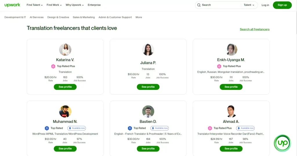 - Upwork 有大量可供选择的翻译员,可翻译各种不同类型的语言。