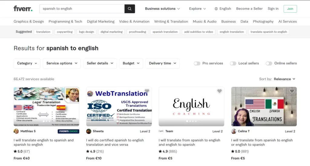 例如,如果您搜索 “将英语翻译成西班牙语”,您就可以找到提供该类型翻译的所有服务提供商。