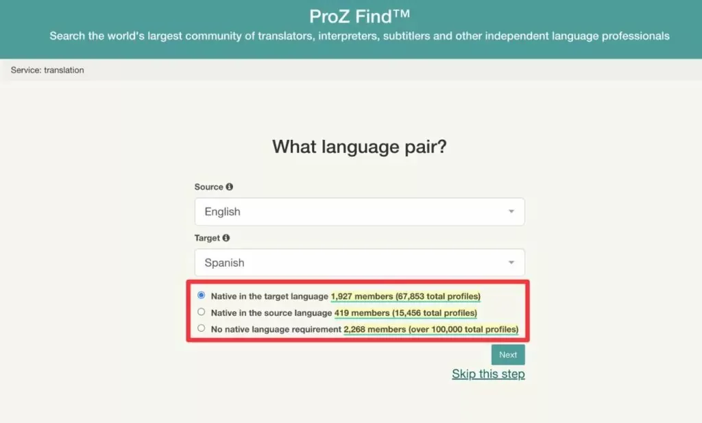 如果您需要的是高质量的自由译者,ProZ.com 还提供了“经过筛选的专业人士”过滤器,让您只浏览经过审核的自由翻译人员。