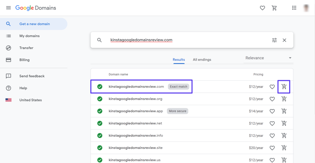 然后,Google 会显示可用的域名扩展名列表。如果一切顺利,您应该会在所需域名旁边看到一个绿色的复选标记,这意味着该域名可用。点击购物车图标,将其添加到购物车中: