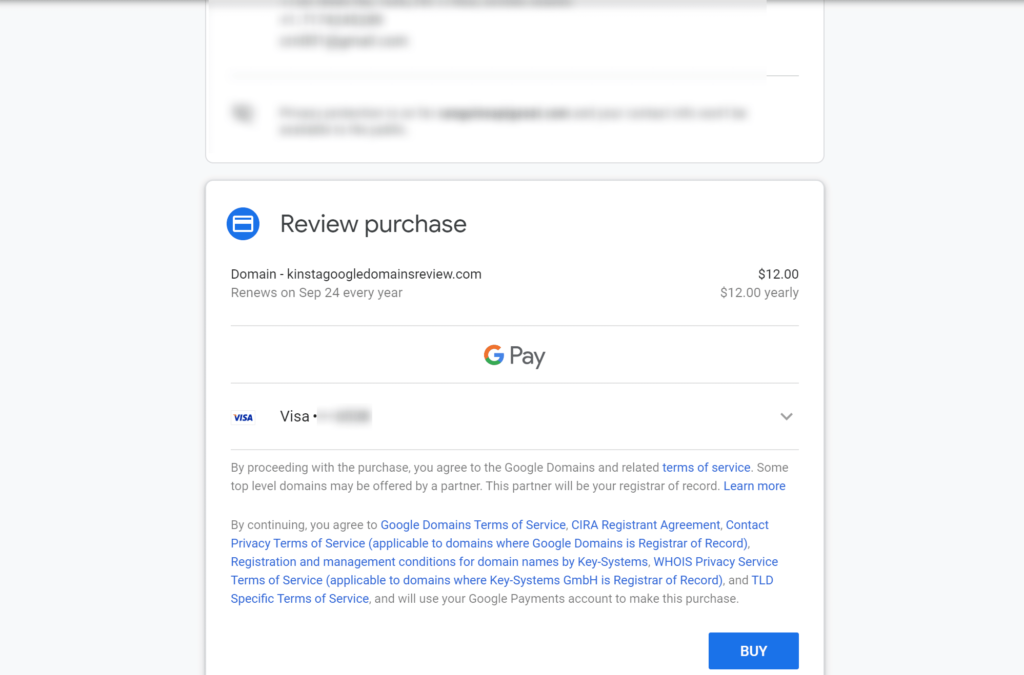 Google Domains 会显示您的购物车摘要以及两个选项,默认情况下这两个选项都是启用的: