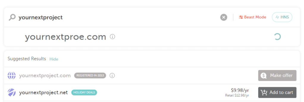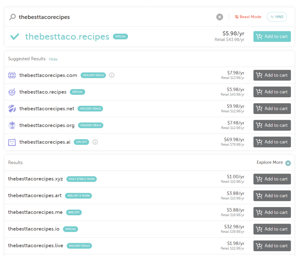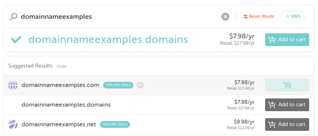 域名注册商允许您查询任意数量的名称。平台会显示每次搜索都有哪些 TLD 可用。考虑到 .com 和 .net 域名的受欢迎程度,它们会出现在任何搜索的第一条结果中,方便您比较各种选择。