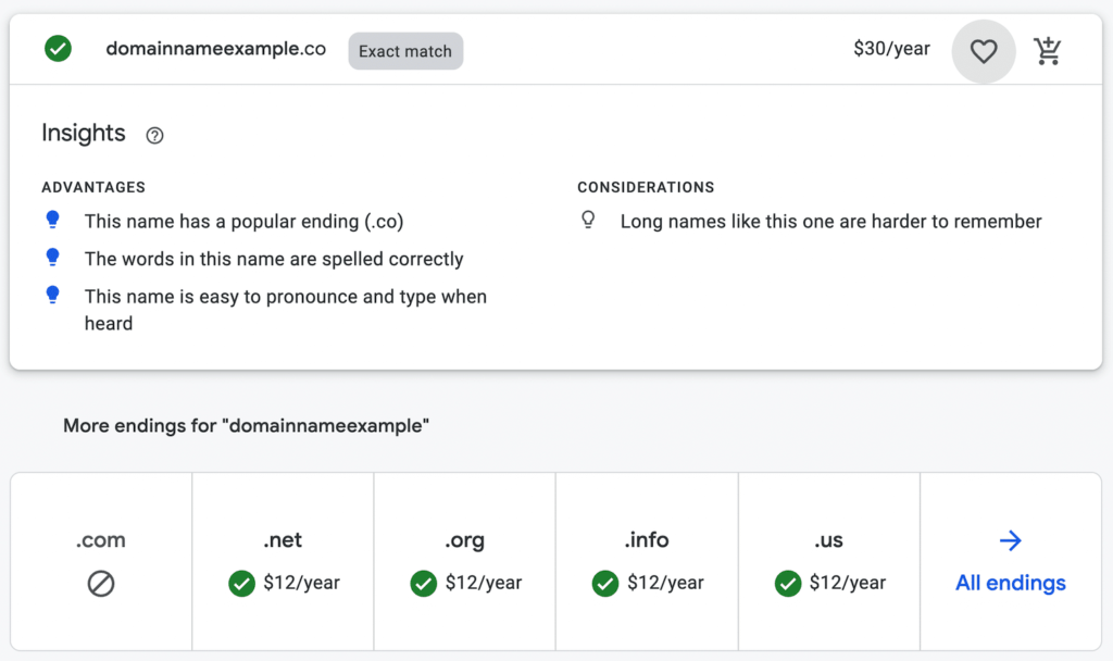 您可能还想将您的主要品牌和/或重要关键词融入其中。重要的是,不要让您对特定域名后缀的渴望超过这些其他因素。