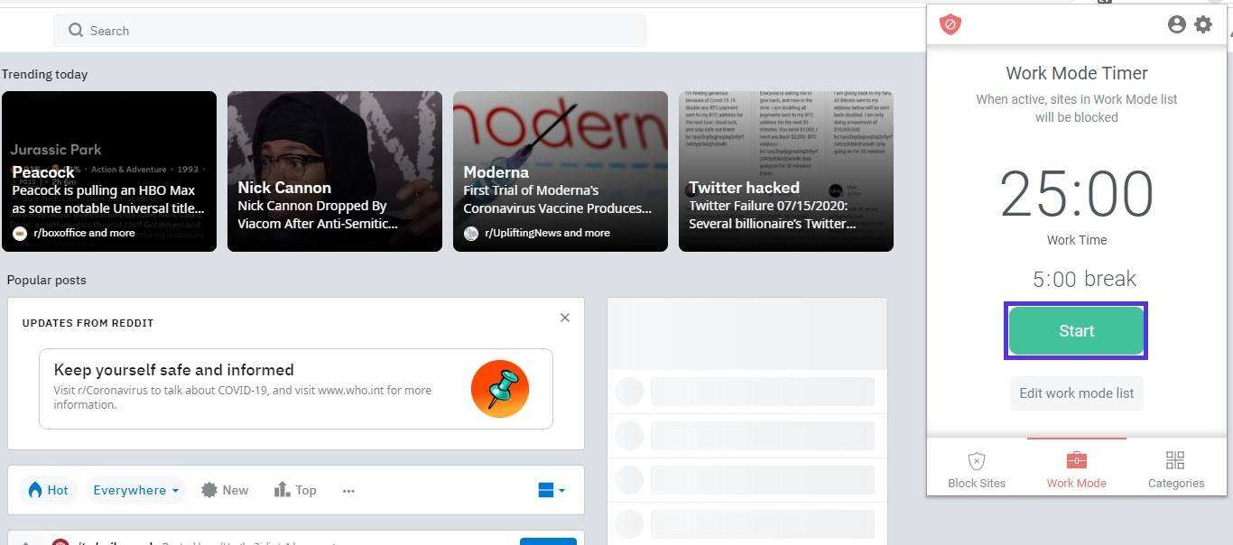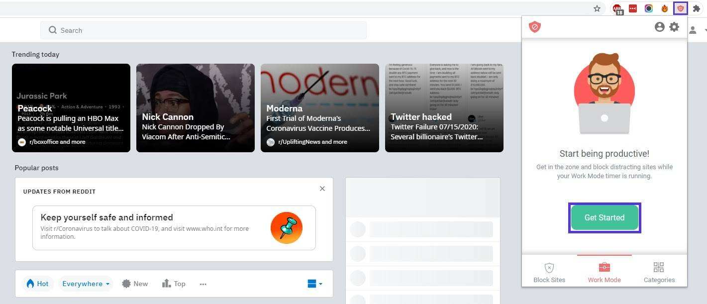 接下来,点击工具栏中的 BlockSite 图标,导航到 “Work Mode” 选项卡,然后点击 “Get Started” 按钮。