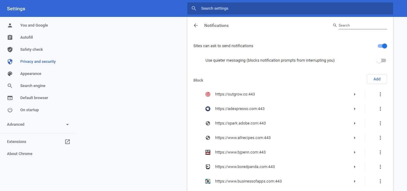 现在,你既可以完全拦截网站请求发送通知的权限,也可以通过 URL 屏蔽单个网站。