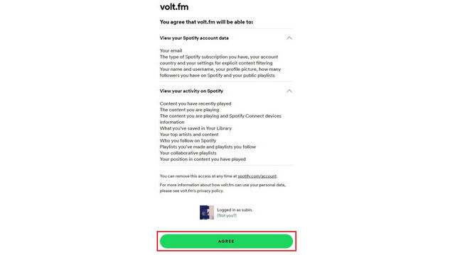 2. 现在,您应该允许 Volt.fm 访问您的 Spotify 账户数据以生成见解。点击 “Agree” 继续。