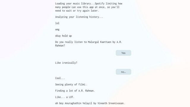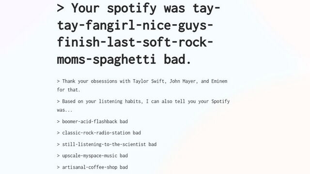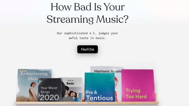 1. 你可能还记得 2020 年病毒式传播的 “How Bad Is Your Spotify” 测试。这个由人工智能生成的测试对你的音乐品味给出了刻板的尖酸刻薄的评价。如果你感兴趣,可以访问该网站,点击 “Find Out” 开始测试。