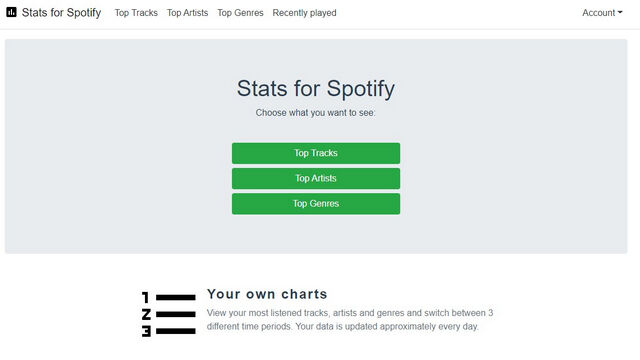 1. Spotify 的统计信息也值得一看。访问该网站并使用 Spotify 账户登录,即可查看您的热门曲目、艺术家和流派。