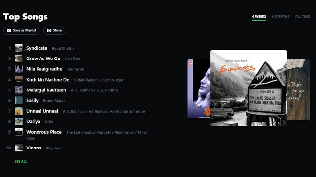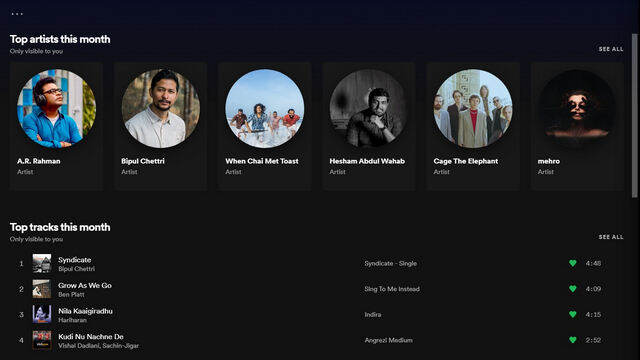 2. 当您的个人档案页面出现时,向下滚动,您将看到当前月份的热门艺术家和热门歌曲。您将在列表中看到总共 10 位艺术家和 50 首歌曲。