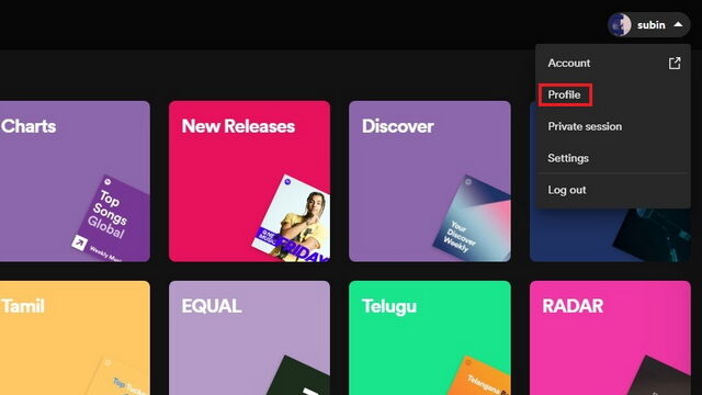 1. 在桌面或网页上打开 Spotify,点击右上角的用户名。在出现的下拉列表中,点击 “Profile” 进入 Spotify 个人档案。