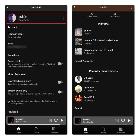 2. 启用切换开关后,向上滚动并点击您的用户名,即可查看您的个人资料。现在,您将在专门的版块中看到最近播放过的艺术家。
