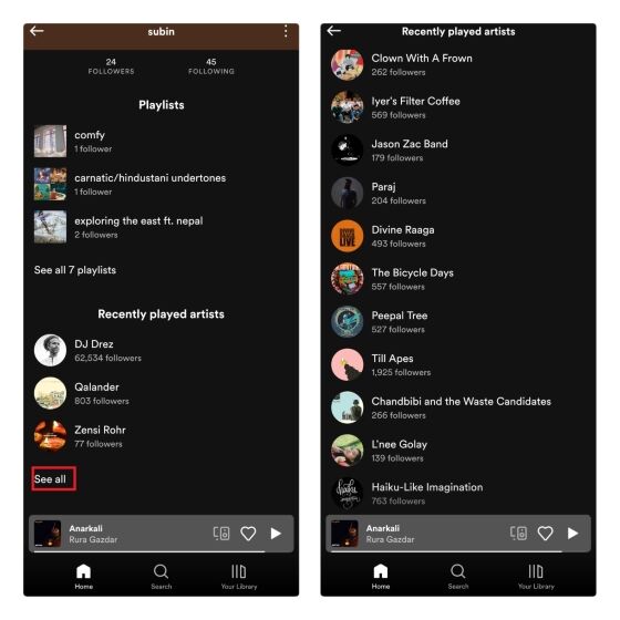 3. 您可以按下 “See all” 按钮,查看 Spotify 上最近播放的艺术家的完整列表。