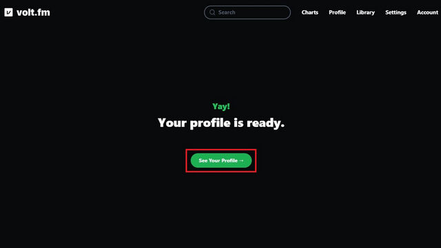 3. 几秒钟后,Volt.fm 会显示您的个人档案已准备就绪。点击 “See Your Profile“,在 Volt.fm 上查看您的 Spotify 统计信息。