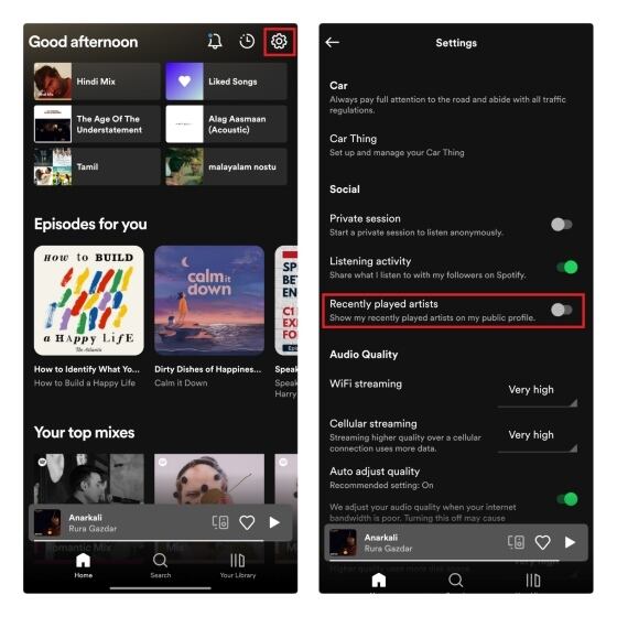 1. 从手机打开 Spotify 应用程序,按屏幕右上角的 “Settings” 齿轮图标。向下滚动,直到在 “Social” 设置中找到 “Recently played artists” 切换按钮,并确保其已启用。您必须启用此切换才能看到最近播放的艺术家。