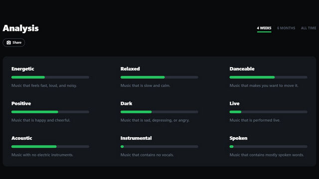6. 如果向下滚动,您会看到一个 “Analysis” 部分,其中突出显示了您所听歌曲的总体情绪。与您的热门歌曲一样,您可以查看过去 4 周、6 个月和所有时间的分析。