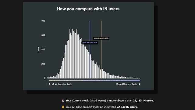 3. 此外,还有一张图表可将您的音乐品味与其他 Obscruitfy 用户进行比较,同时还提供了过去 6 周和所有时间内收听音乐的单独指标。