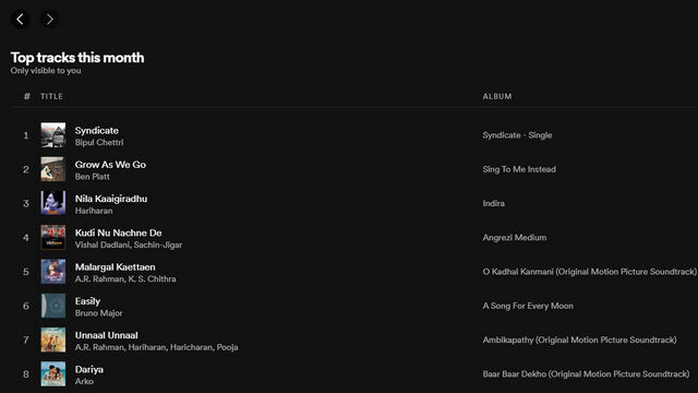 3. 要查看本月 50 首热门歌曲的完整列表,请单击 “Top tracks this month” 标题旁的 “See All” 按钮。现在,您可以浏览过去一个月中您最着迷的歌曲了。