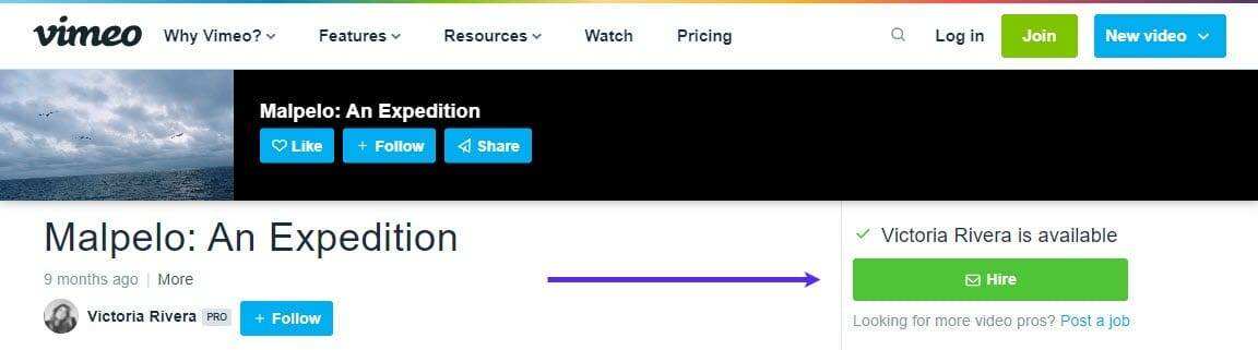 Vimeo的 “Hire” 按钮
