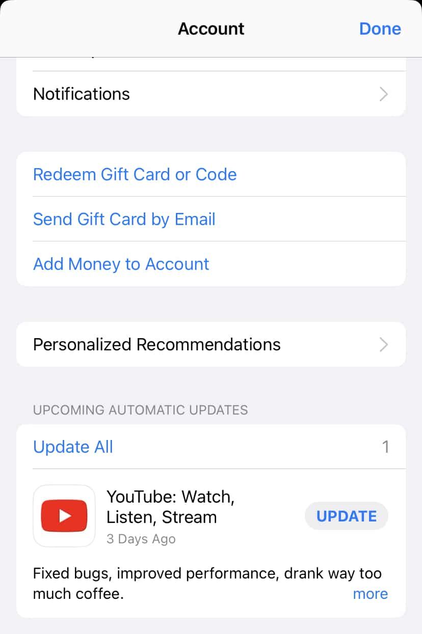 - 向下滚动,找到 “可用的更新” 部分。如果YouTube应用的更新是可用的,你会看到它列在这里。