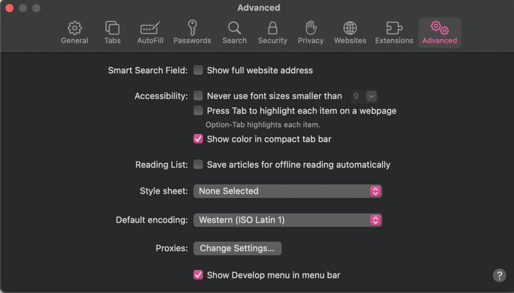 - 点击屏幕底部标有 “在菜单栏中显示开发菜单” 的复选框。