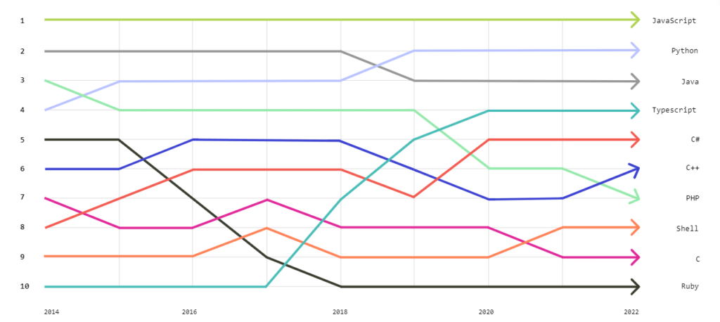 这张图显示了GitHub上最受欢迎的编程语言以及它们在过去几年的使用情况: