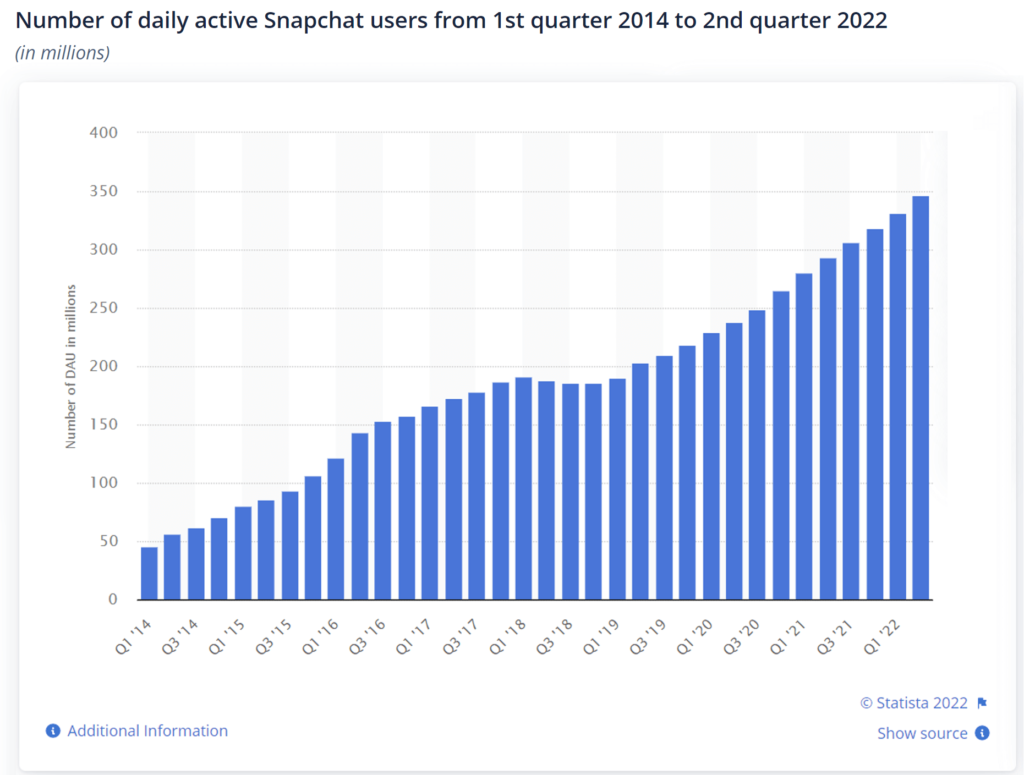 截至2018年第二季度,Snapchat拥有1.86亿活跃用户,而截至2022年第二季度,他们拥有3.47亿活跃用户。这是相当大的成长!