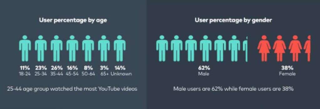 事实证明,YouTube用户主要是男性,占YouTube用户群的 62%。大多数用户最终处于25至44岁年龄段,其中23%位于25至34岁年龄段,26%位于35至44岁年龄段年龄阶层。