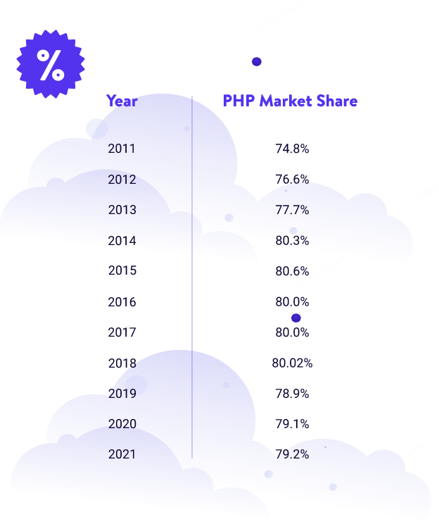 如果您使用的是CMS,那么您的网站很可能是由PHP驱动的,即使您从未亲自处理过一行代码。考虑到这些系统在网站开发中的流行程度,PHP的市场份额在过去十年中一直保持稳定是有道理的: