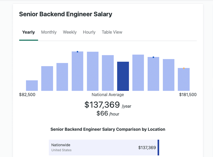 ZipRecruiter列出了高级后端开发人员的平均年薪为137,369美元(最低为82,500美元;最高为181,500美元)。