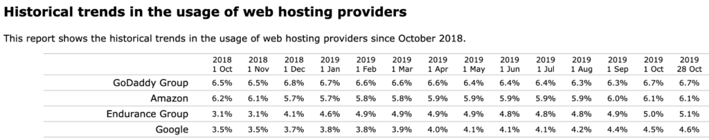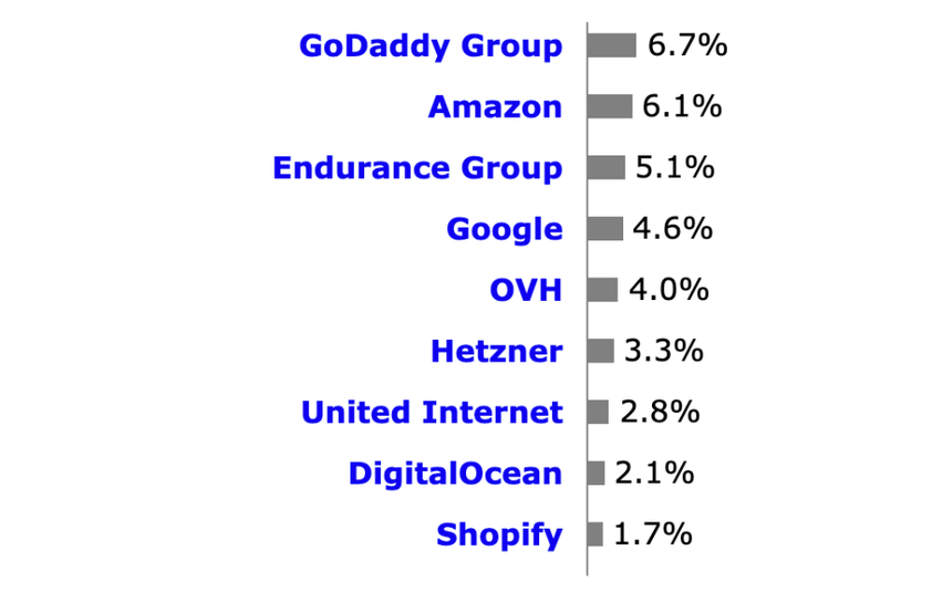 如您所见,4.6%的市场份额意味着谷歌排在第四位,仅次于亚马逊、GoDaddy和Endurance Group(正好在OVH之上)。尽管第四名已经足够令人印象深刻,但值得注意的是,谷歌在超过 100 个其他托管平台的列表中达到了这一目标。