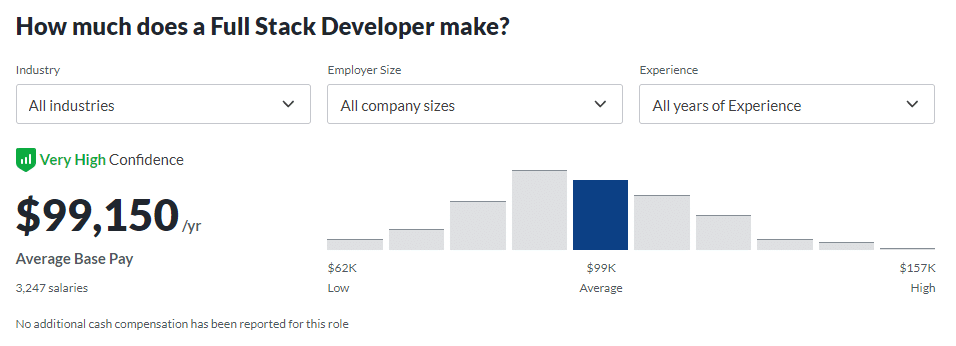 全栈开发人员是一个罕见的类别,平均每年收入97,000美元。虽然你的工作比类似的工作多一点,但其他类型的开发人员设法跟上工资部门的步伐。所以你可能有双倍的技能,但你绝对不会因为你的麻烦而获得双倍的收入。
