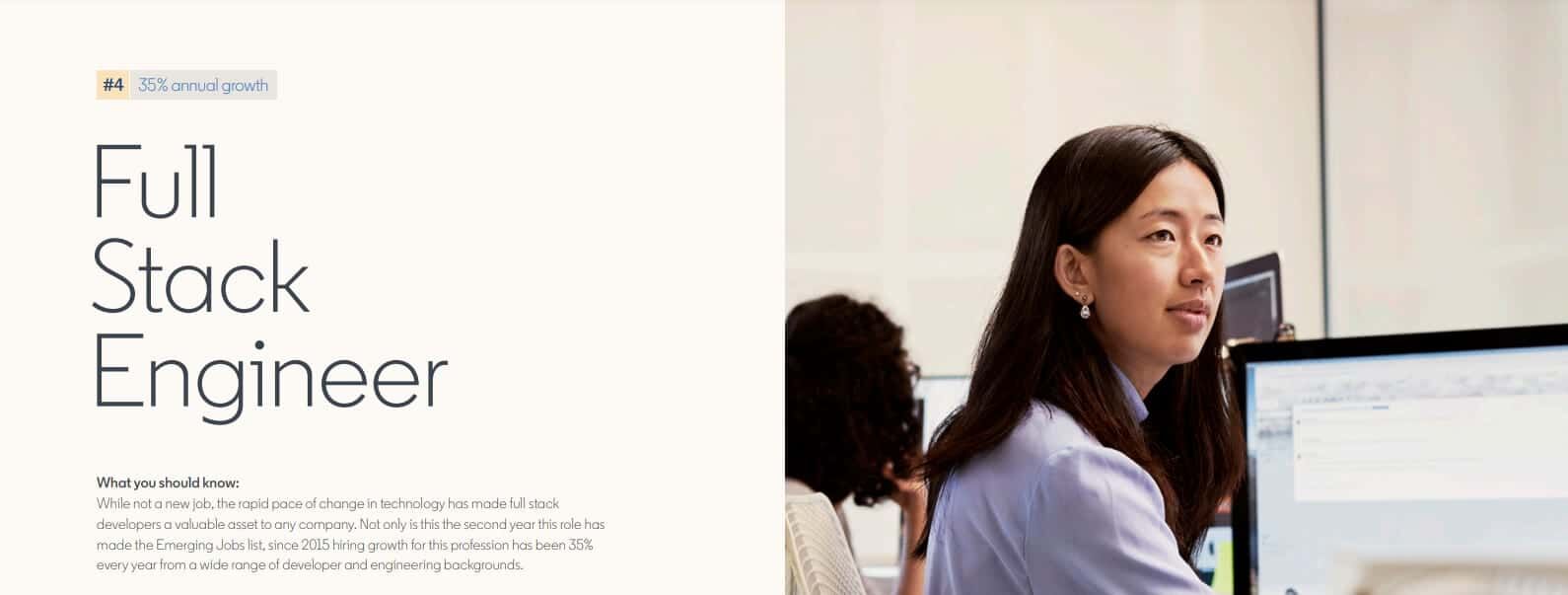 2020 年,LinkedIn发布了他们的新兴工作报告,其中“全栈工程师”连续第二年上榜。该报告甚至指出,自2015年以来,这项工作的增长率每年增长35%。