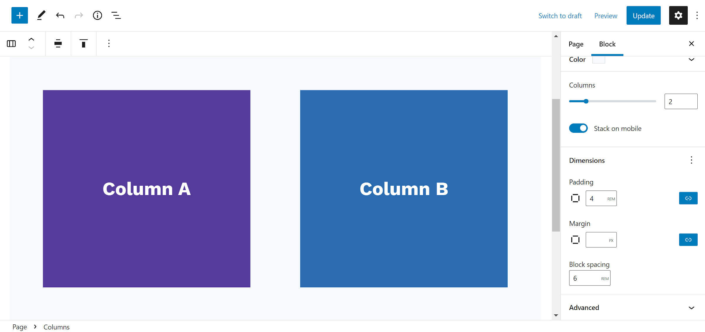 用户现在可以通过新的区块间距选项完全控制列之间的间隙。自区块编辑器发布以来,它花了三年时间才正式提供这个支持,这让用户很痛苦。诚然,当时对CSS flexbox的支持gap并不普遍,但在此期间我们仍然可以使用老式的边距进行管理。