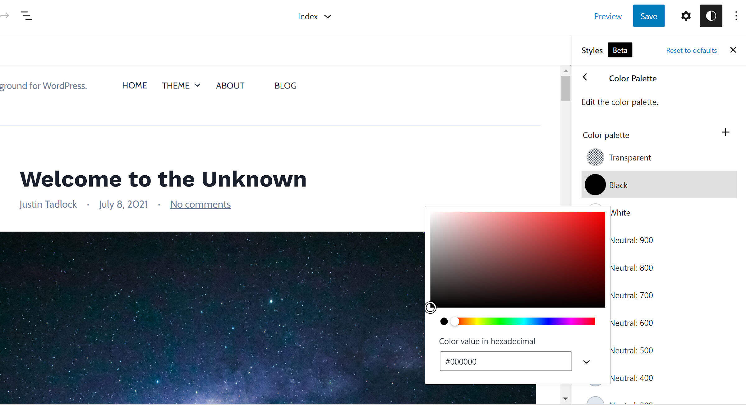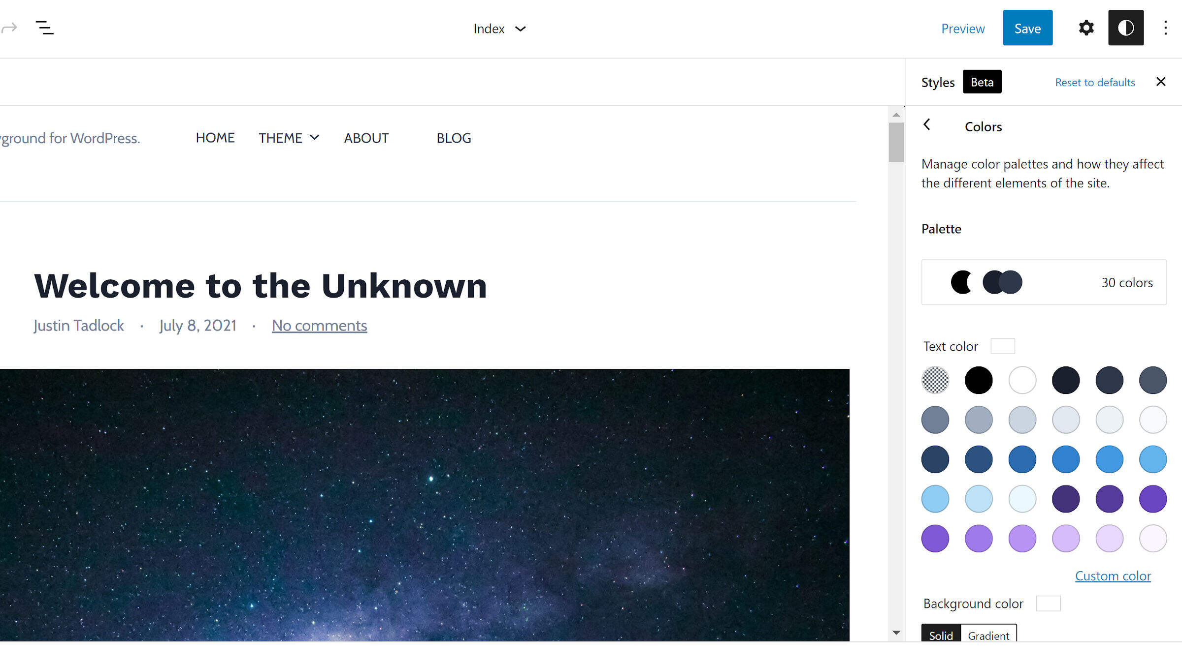 打开调色板部分后,用户可以编辑主题定义的颜色或单击+图标创建新颜色。这些颜色将全部显示为区块和站点编辑器中的选项。