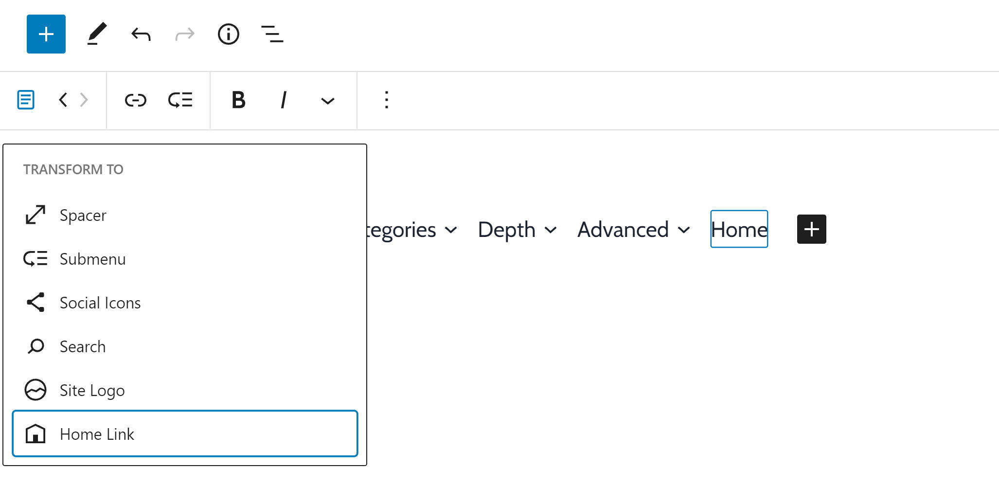 有一个地方可以添加主页链接,那就是通过单击工具栏中的图标将菜单项转换为主页链接区块。其他块也可用于此转换过程,例如社交图标、站点徽标等。