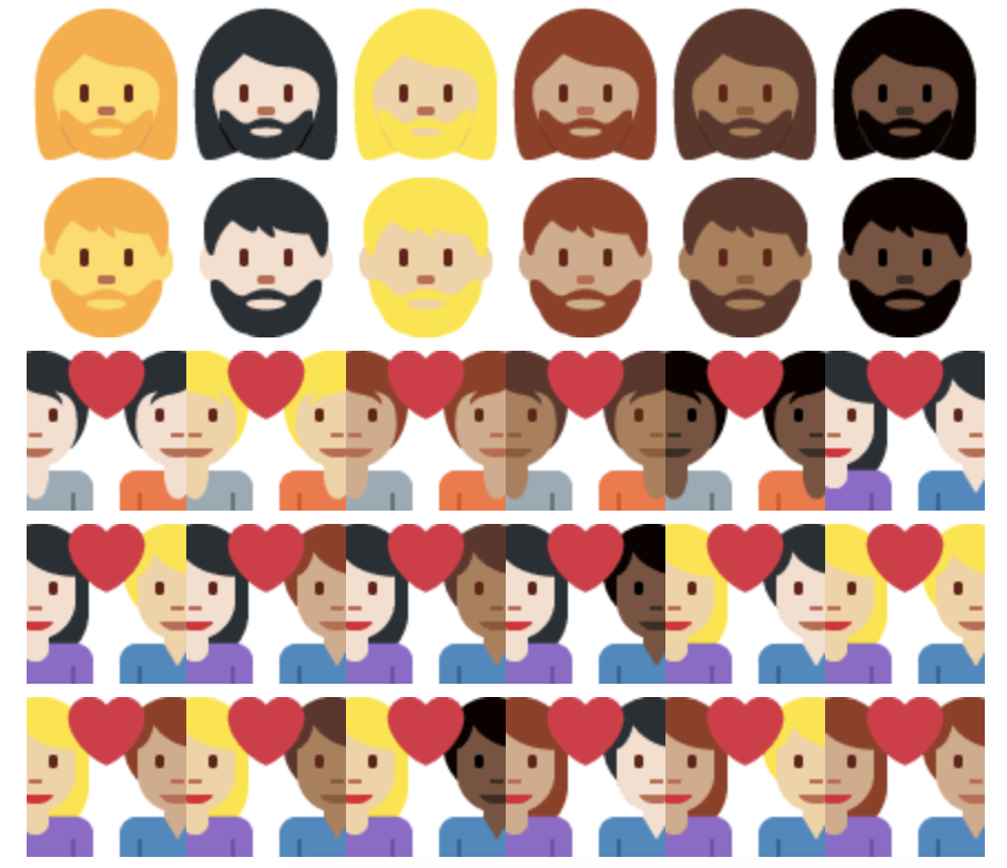 13.1版为“亲吻”表情符号和“情侣心”表情符号的所有变体添加了混合肤色支持。它还可以在所有肤色变化中添加一个有胡子的男人或一个有胡子的女人。