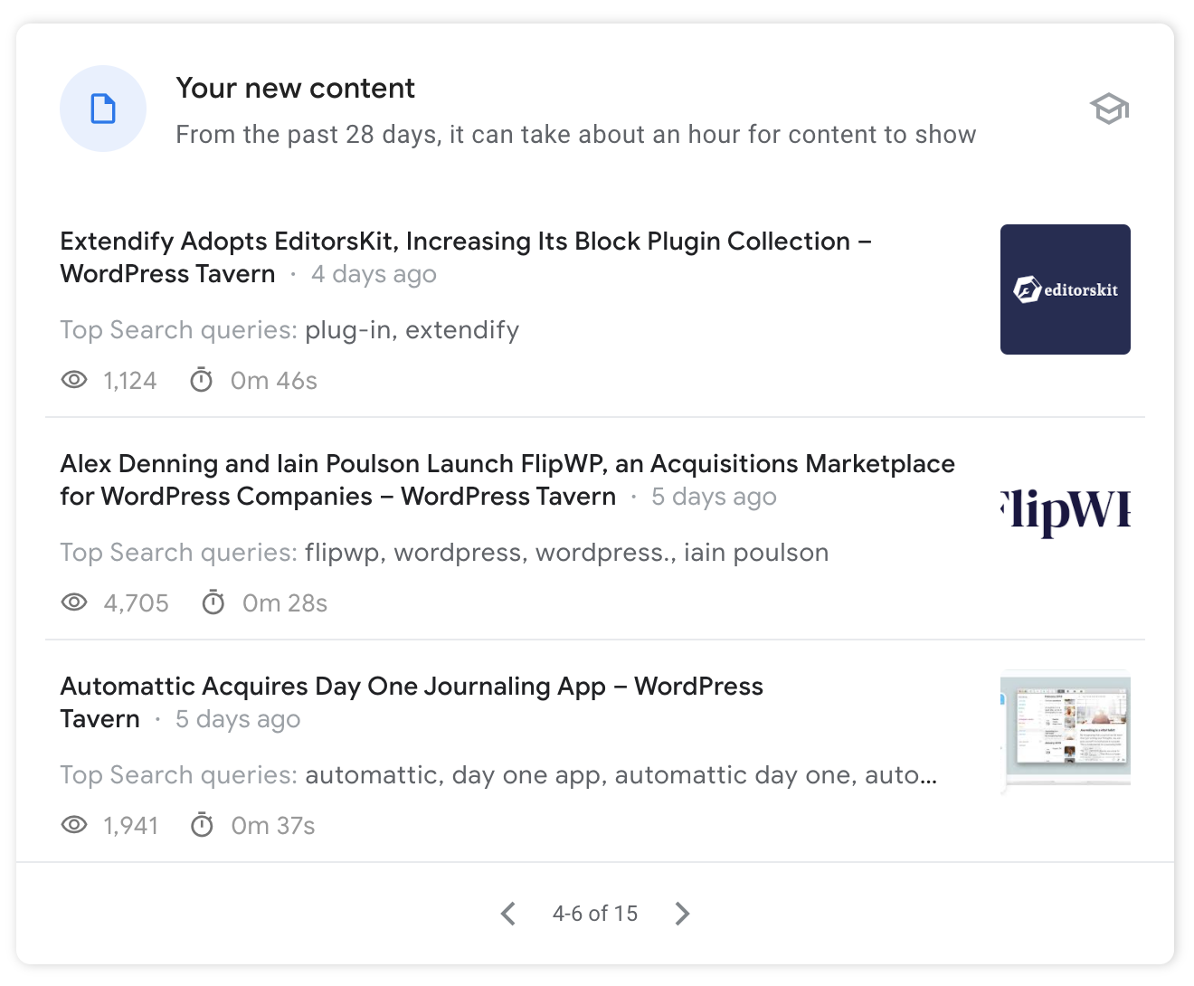 第一部分通过页面浏览量和页面浏览持续时间显示过去 28 天网站的内容性能趋势。下一张卡片显示新内容的轮播,包括页面浏览量、平均页面浏览持续时间以及与网站上其他内容相比平均持续时间较长的内容的徽章。
