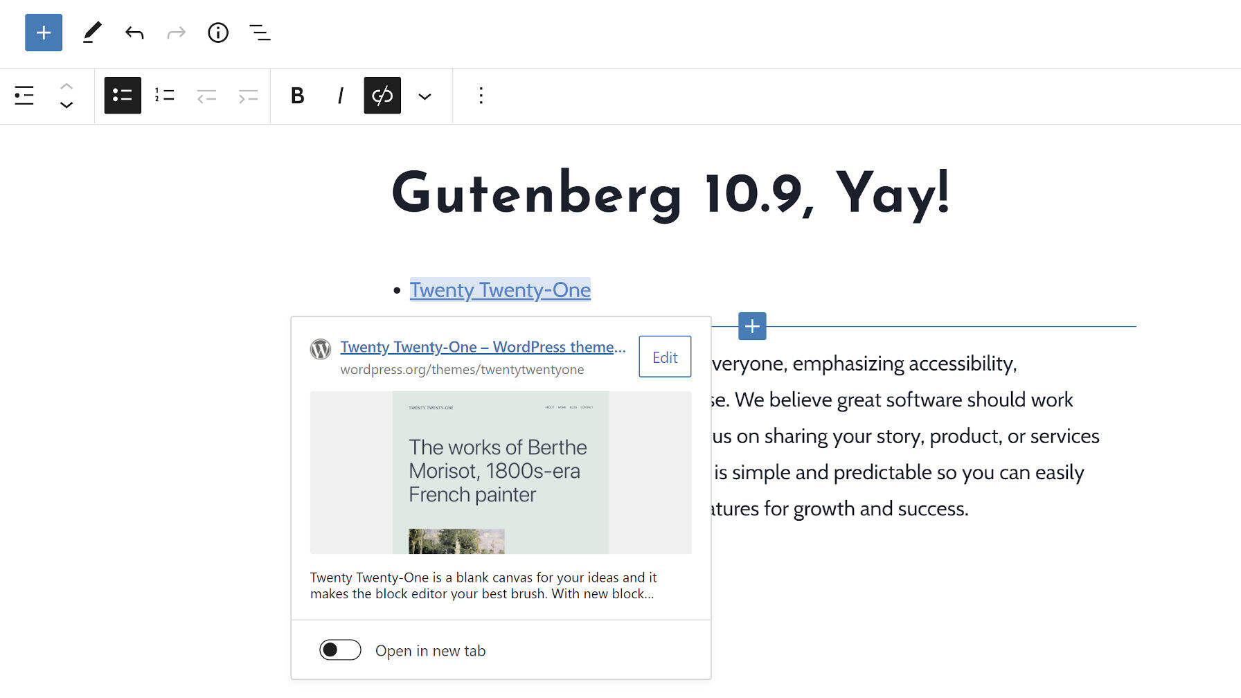 编辑器现在将在链接编辑器弹出窗口中显示网站预览。此功能仅适用于富文本上下文中的链接,例如段落、标题和列表区块中的链接。预览也仅在设置并单击链接后出现,而不是在最初键入时出现。