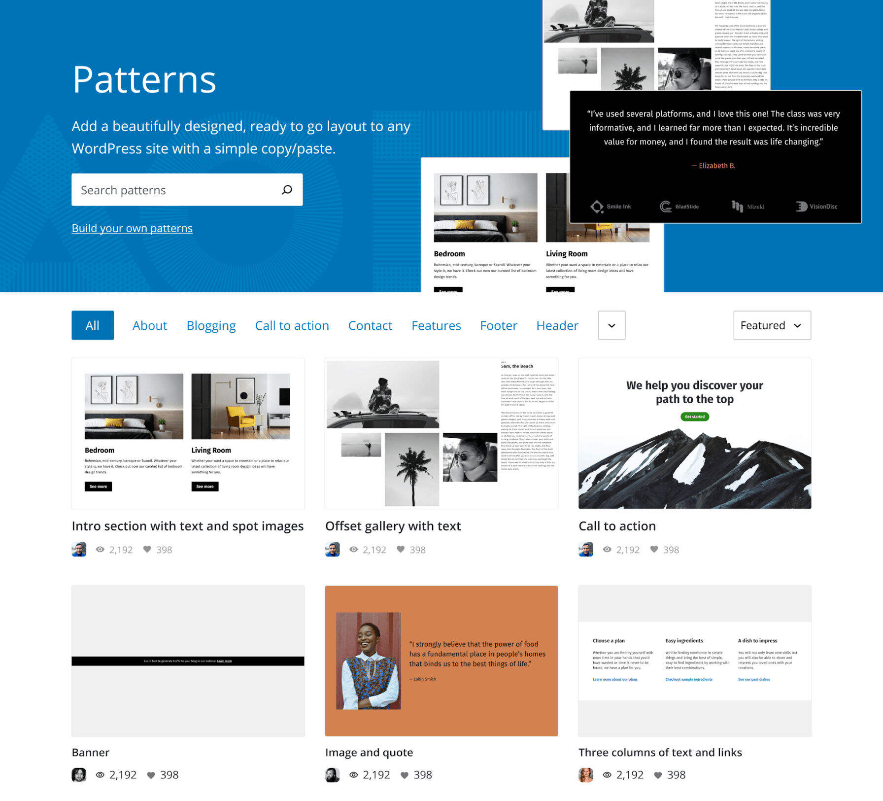 Gutenberg 现在通过WordPress.org上的模式目录提供其默认区块模式。这将他们的开发移到插件和核心WordPress之外,这意味着设计人员可以在不需要用户更新的情况下对其进行迭代。他们将始终拥有编辑器提供的最新版本。