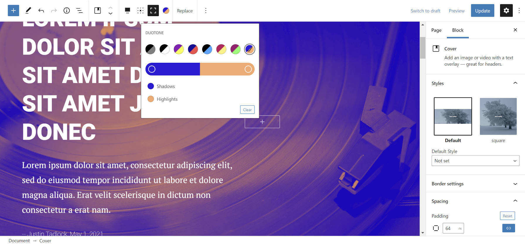 新的双色调过滤器工具是我最喜欢的古腾堡(Gutenberg)功能之一。老实说,过去一天我大概花了两个小时来修补它。其中一些正在为我一直在构建的主题构建自定义的双色调调色板,但是其中大多数只是在玩耍而已。