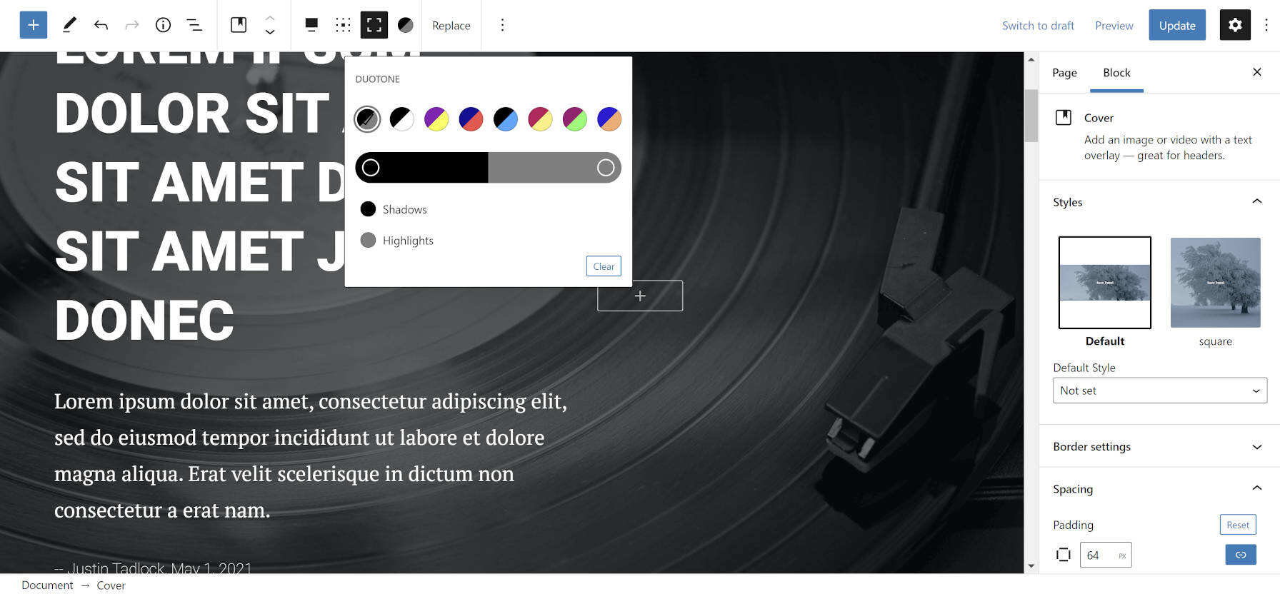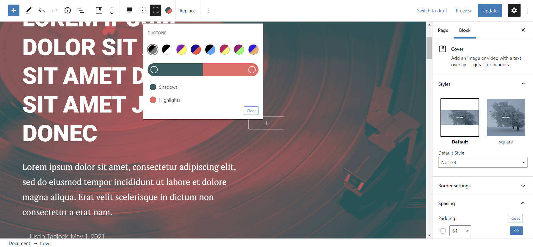 该功能适用于“图像”和“封面”区块。但是,它不适用于启用了“固定背景”设置的封面。有工单要求在这种情况下禁用双色调过滤器功能。