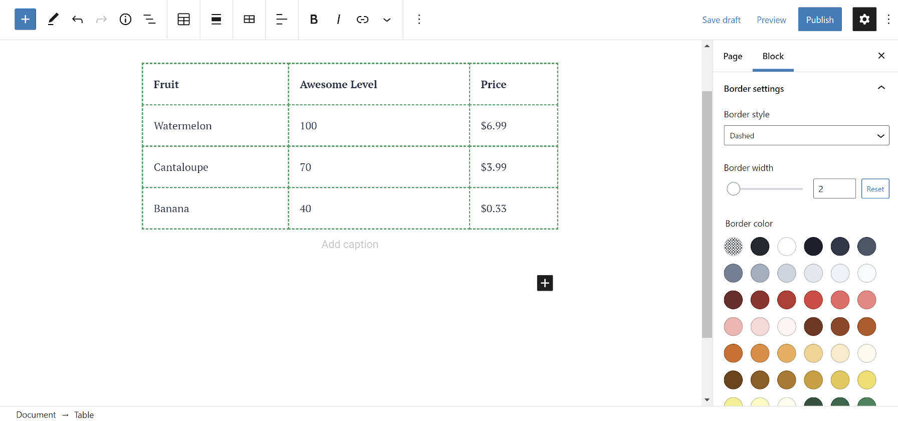 对于其他所有人,您现在可以享受Table块的边框设置。边界控制尚未普及。但是,对于尚未使用它们的人来说,它们是相对基本的。该功能添加了一个新的区块选项选项卡,用于选择边框样式(无,实线,虚线和点线),宽度和颜色。