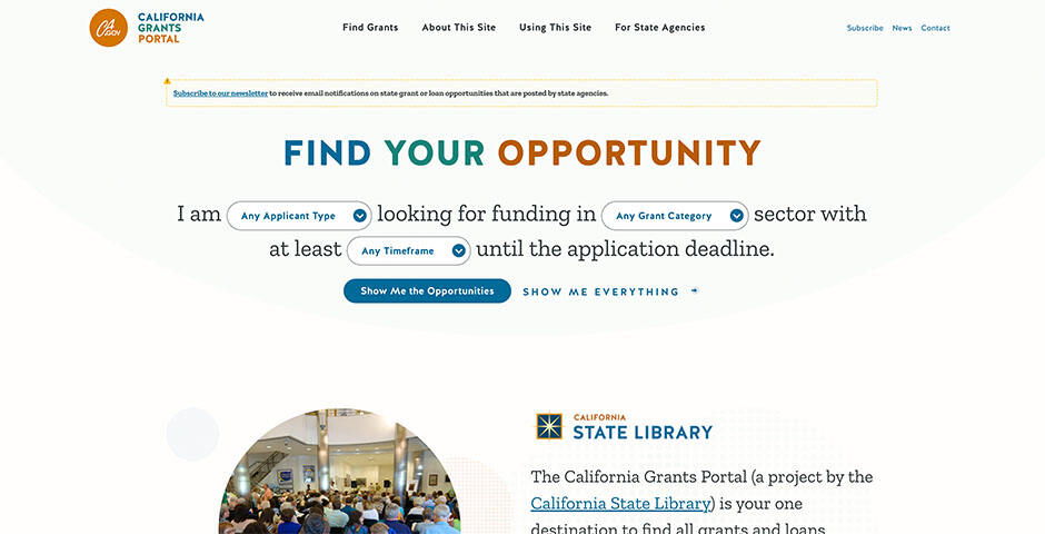 10up在同一政府和公民创新类别中还有另一个竞争网站,即“The California Grants Portal”。该公司设计并建立了一个门户网站,供各州机构提交其赠款数据。
