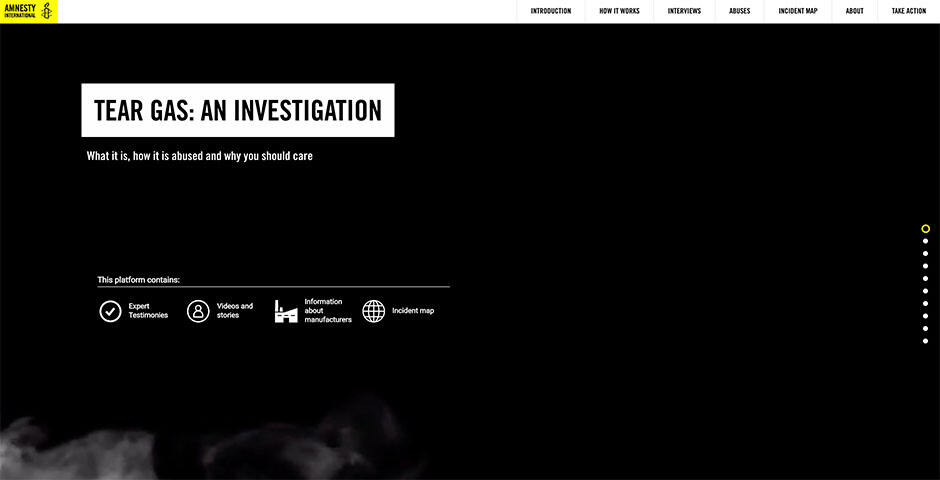 在激进主义类别中,国际特赦组织Amnesty Internationa的由WordPress驱动的催泪瓦斯调查网站目前处于领先地位。Visualize NYC 2021,该类别中的另一个WordPress网站,目前排名第五。两者都是黑白设计的有力示例,旨在引起访问者的回响。