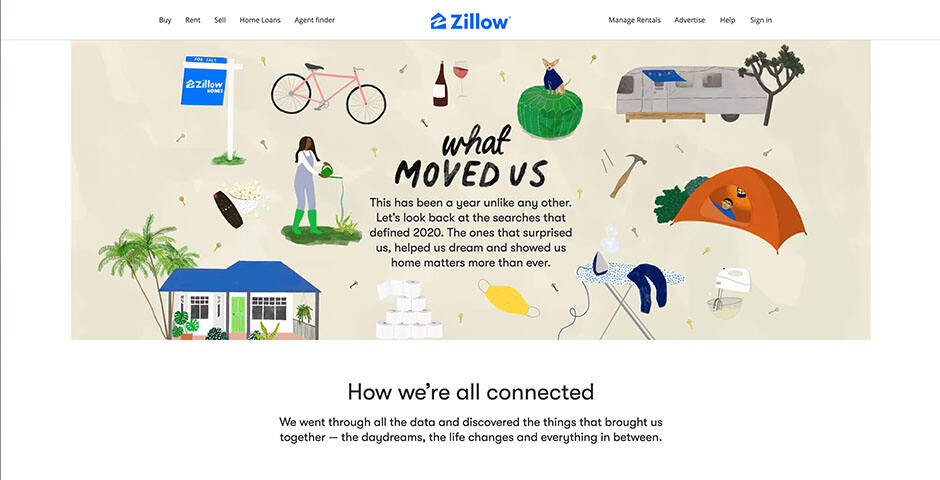 在过去的一年里,房地产一直是一个热门行业,房地产类提名者中有五分之二都在WordPress上运行:美国建筑商网站Tri Pointe Homes和Zillow的“What Moves Us”网站。Zillow目前排名第二,其WordPress驱动的着陆页详细介绍了访问者的搜索行为。它还显示了过去一年的销售和搜索中令人惊讶的事实,例如“ 2020年,八分之一的人看不到要约。” 该页面的插画精美,在移动端和PC端表现都一样好。