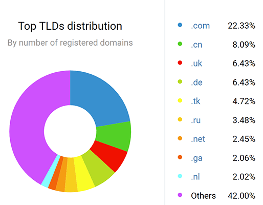 此外,.com域名扩展名是注册域名的第一选择,占总域名分配的22.33%。位于第二位的是.cn域名占8.09%,.uk域名占6.43%和.de域名占6.43%。
