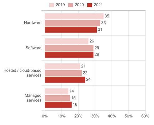 - 在线业务可能会这样分配预算:硬件35%,软件25.7%,托管/基于云的服务20.8%,托管服务13.9%(9%将用于网络托管,以及4%用于云存储) )