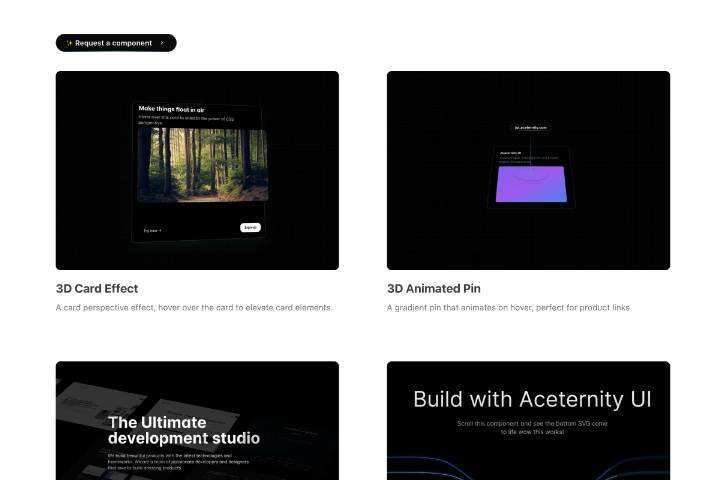Aceternity UI 的微交互和动画库正在掀起一股热潮。这些元素可以直接复制和粘贴到项目中,从而简化了设计和开发过程。对于那些希望通过动态功能来丰富网站内容,同时又想将复杂性降到最低的人来说,这是一个极好的资源。