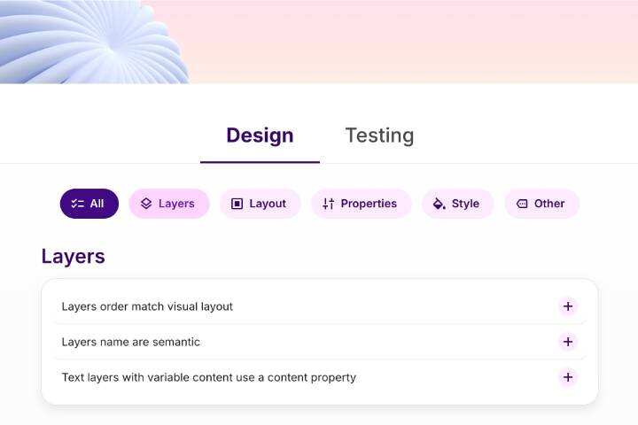 Figma Checklist 是使用 Figma 进行设计和开发的人员必不可少的资源。该工具分为“设计”和“测试”两个类别,有助于全面审查组件的质量和完整性。