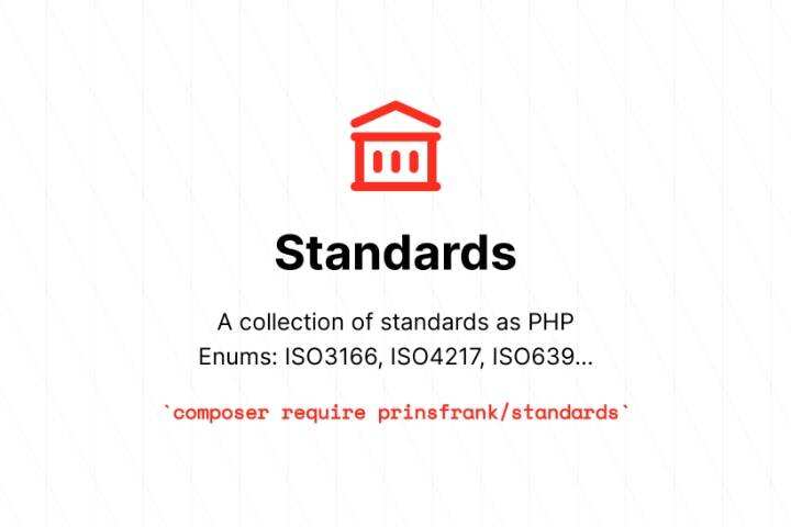 prinsfrank/standards 是一个开创性的 PHP 库,它为各种标准引入了 PHP 本地枚举,包括 ISO3166 国家、ISO4217 货币和 ISO639 语言。